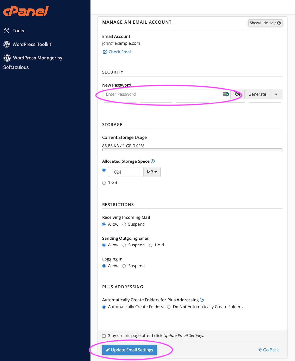 5) Enter your new password under New Password then scroll down and click Update Email Settings.