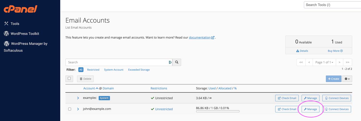 4) Select Manage next to the email that you would like to congifure.