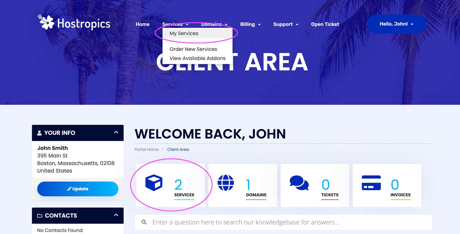 1) Go to the hostropics.com Client Area by pressing the login button at the top of any page or by visiting https://www.hostropics.com/panel/clientarea.php and log in: