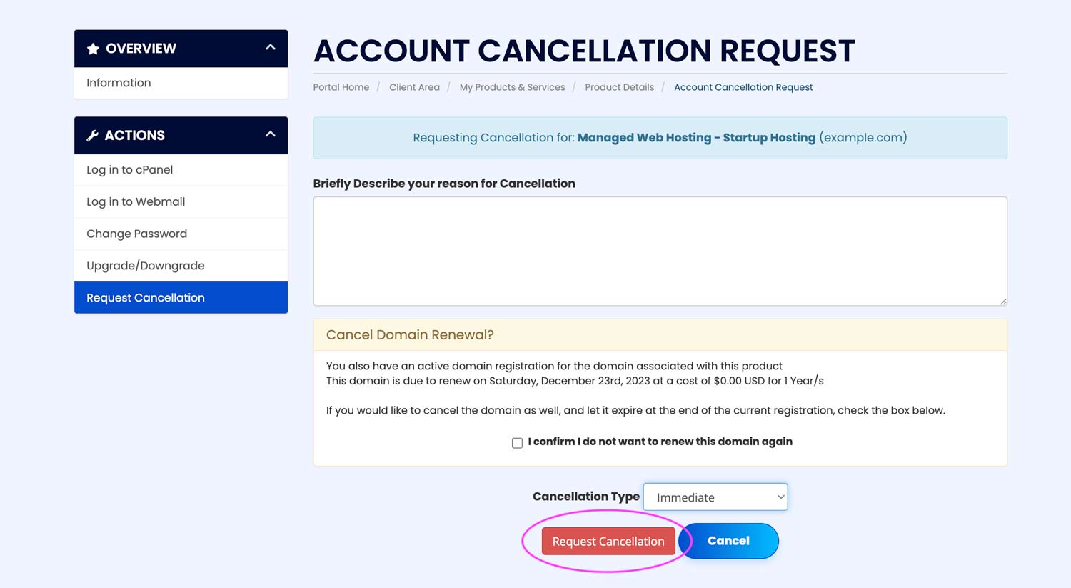 • Cancel Domain Renewal (optional): This option enables you to also cancel the auto renewal on the domain if it comes with your service. Leave the box unchecked if you plan to keep the domain.